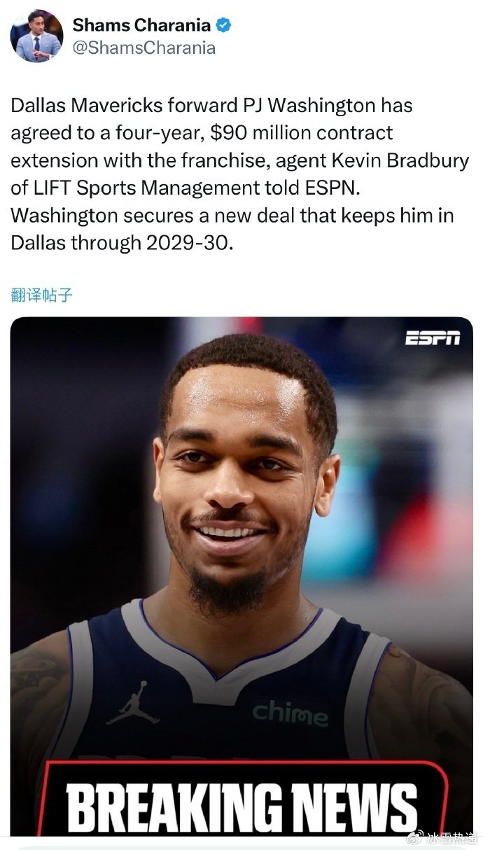 北京时间9月12日,达拉斯独行侠官宣,正式与球队主力前锋球员PJ-华盛顿完成续约。根据此前ESPN名记Shams报道,华盛顿与独行侠达成的是4年9000万美元的提前续约合同,且续约之日起有6个月的交易限制期。